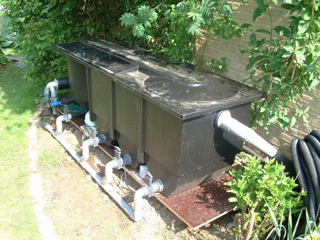 Dans ce cas, le filtre est enterré et est connecté au bassin par l’intermédiaire d’une ou de plusieurs bondes de fond. Ce système est en équilibre par le principe des vases communicants ; ceci a pour effet une consommation minimale car il n’y a pas d’eau à relever.