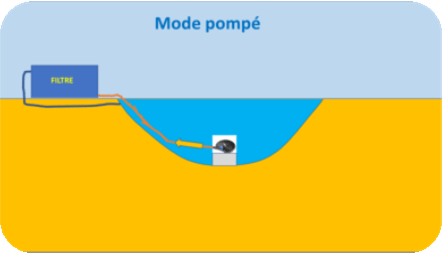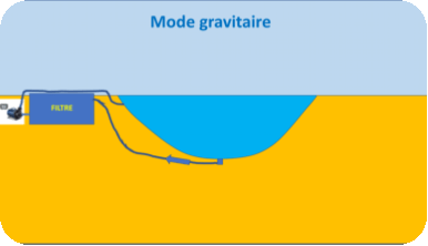 Ce mode est principalement adapté pour un filtre à grille. Comme pour le mode gravitaire, une ou plusieurs bonde(s) de fond alimente(nt) un puisard dans lequel se place la pompe.