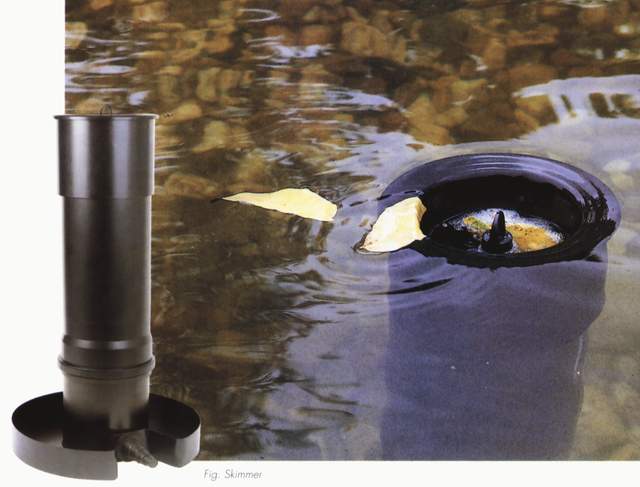 Le skimmer doit pouvoir fonctionner avec une différence de niveau d’eau, la plupart acceptent une variation du niveau d’eau de 12 cm dans le bassin. Pour faire fonctionner un skimmer, il faut lui adjoindre une pompe en mode pompé, ce qui n’est pas toujours le cas en mode gravitaire. L’idéal est d’alimenter le filtre biologique avec cette même pompe (voir schéma) ou avec une cascade secondaire.