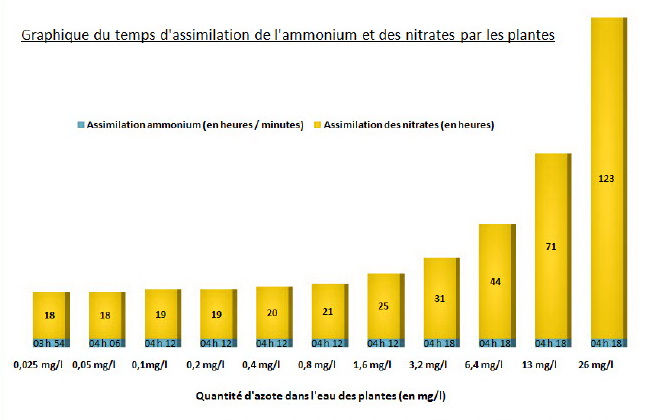 Certaines plantes terrestres préfèrent les nitrates à l’ammonium. On a supposé qu’il en fut de même pour les plantes aquatiques. Pourtant, après des études expérimentales, on a pu constater le contraire. Les scientifiques qui ont réalisé l’étude de l’assimilation de l’azote par plusieurs variétés de plantes ou végétaux aquatiques ont pu constater que, seule, une minorité préfère les nitrates à l’ammonium. Il est apparu que l’absorption de l’ammonium et son assimilation exigent moins d’énergie pour les plantes.