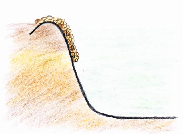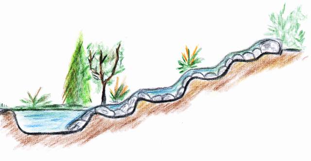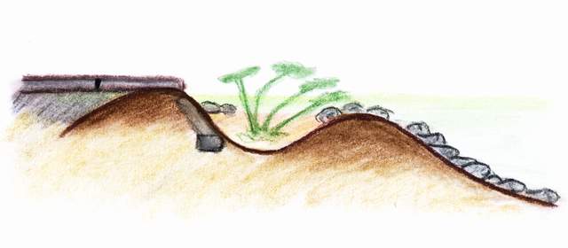 Bord avec passage en plaques et jardin alpin. Vous remarquerez la zone de drainage au pied du jardin alpin.